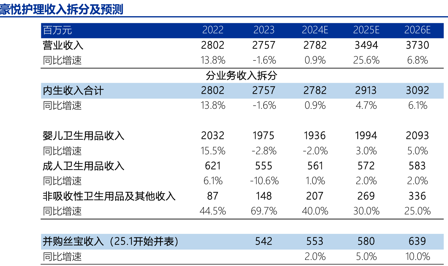 其次是2025年1月开始并表的丝宝护理,2023年丝宝收入为5.42亿元,考虑豪悦收购丝宝后,对其进行供应链、资金、管理等赋能,“洁婷”卫生巾收入增长有望提速。