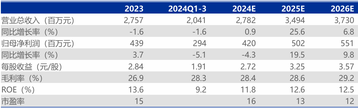 盈利预测与估值来看,预计2024-2026年公司归母净利润分别为4.20、5.02、5.51亿元,分别同比-4.3%、+19.5%、+9.8%,当前对应2026年PE不到20倍。