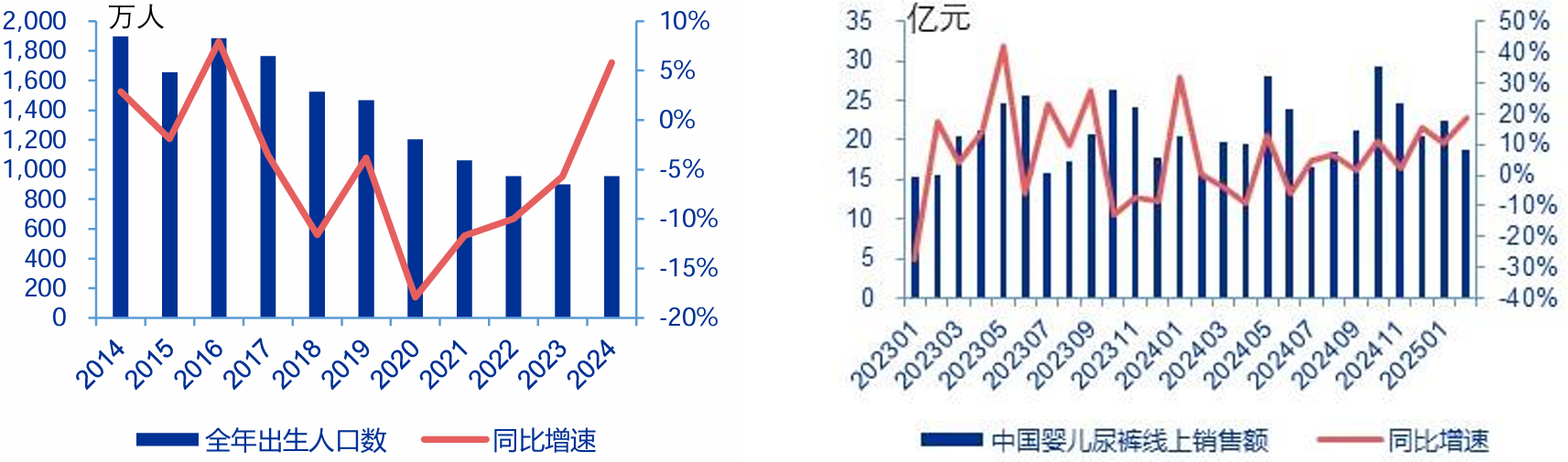 2024年出生人口数止跌,婴儿尿裤市场需求有望修复。近年来中国出生人口数趋势下滑,2024年出生人口数恢复增长,考虑新生儿一般使用尿裤年龄为0-3岁,预计婴儿尿裤行业需求将有所修复。根据久谦数据统计,2024年下半年以来中国婴儿尿裤线上销售额增长有所改善,2024年12月、2025年1月、2025年2月,电商GMV分别同比增长15.5%、10.3%、18.8%。