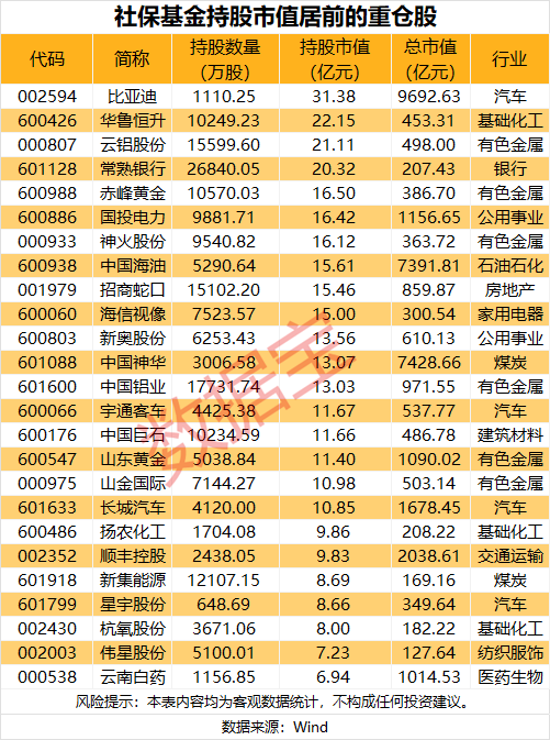 据证券时报·数据宝统计,截至最新,去年四季度末社保基金共现身184股前十大流通股东名单中。按12月31日收盘价计算,合计持股市值达到716.22亿元,18股持股市值超10亿元,比亚迪、华鲁恒升、云铝股份持股市值居前,分别为31.38亿元、22.15亿元、21.11亿元。