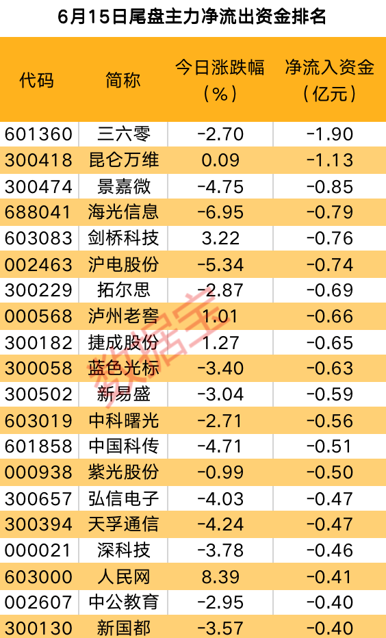 数据宝统计,6股尾盘净流出资金超7000万元。三六零尾盘主力资金净卖出1.9亿元,居首位;其后昆仑万维、景嘉微和海光信息尾盘主力资金均出逃超0.75亿元。