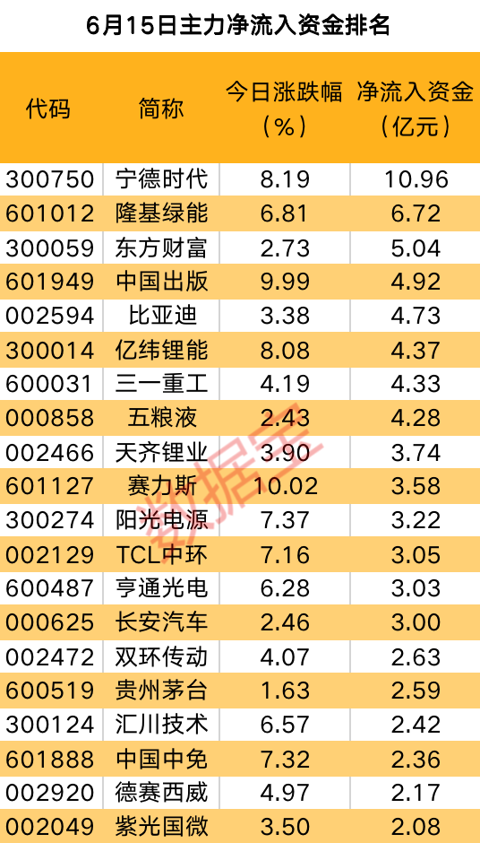 流入资金居前的还有隆基绿能、东方财富和中国出版,主力资金净流入分别为6.72亿元、5.04亿元和4.92亿元。