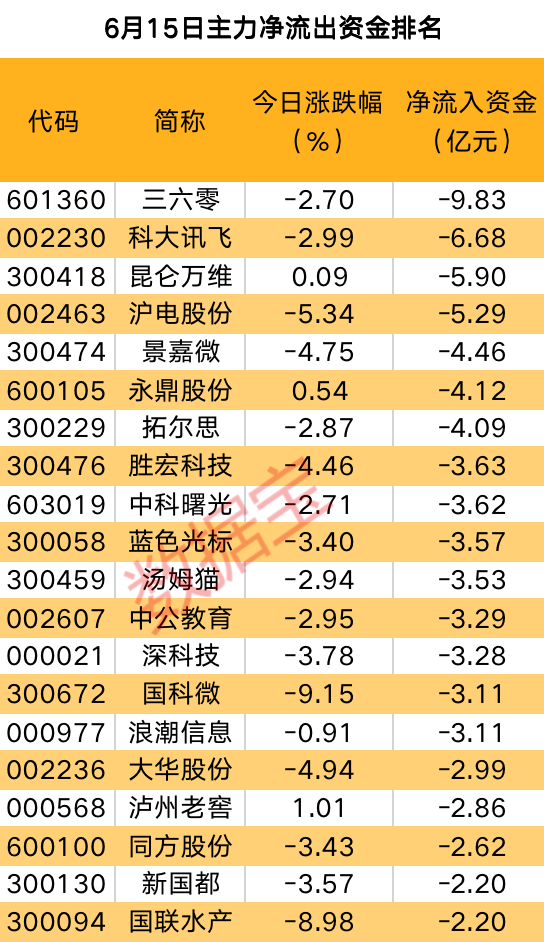 证券时报·数据宝统计,6月15日,沪深两市主力资金净流出127.06亿元,其中创业板净流出65.62亿元,沪深300成份股净流入43.68亿元。