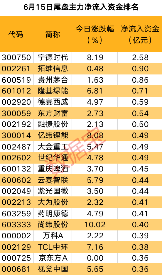 从个股看,4股尾盘净流入资金超7000万元。宁德时代尾盘获抢筹2.58亿元居首。拓维信息、贵州茅台和隆基绿能紧随其后,分别净流入0.9亿元、0.86亿元和0.71亿元。