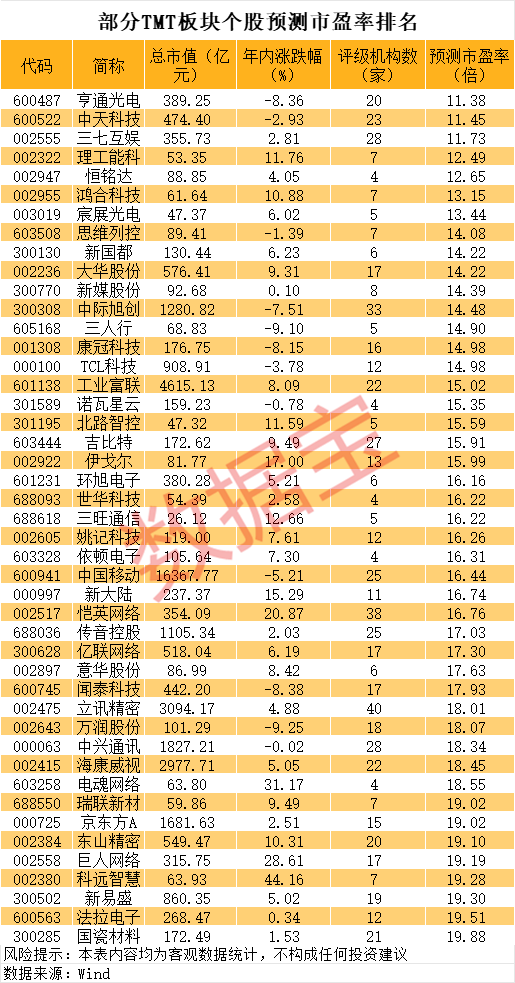据统计,剔除出版行业后,TMT板块中,有45只个股根据机构一致预测今年净利计算的市盈率低于20倍。其中,亨通光电、中天科技、三七互娱等个股市盈率均不足12倍。从机构关注度来看,立讯精密、恺英网络、中际旭创等个股均有30家以上机构评级。