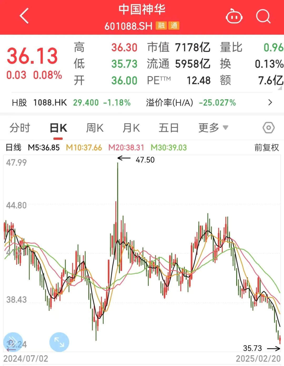 作为高股息龙头股的代表之一,中国神华近期也出现了回调。截至2月19日,中国神华收报36.1元/股,再创年内新低,累计跌幅接近17%,市值接近6900亿元。今天早盘该股继续回调,盘中一度跌超1%,最低至35.73元/股,续创年内新低。