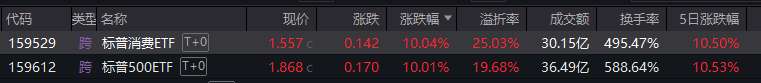 具体来看,标普消费ETF和标普500ETF分别收涨10.04%、10.01%,成交额分别达到30.15亿元和36.49亿元,换手率达到495.47%和588.64%,溢折率也达到25.03%和19.68%,是目前市场中溢价率最高的跨境产品。