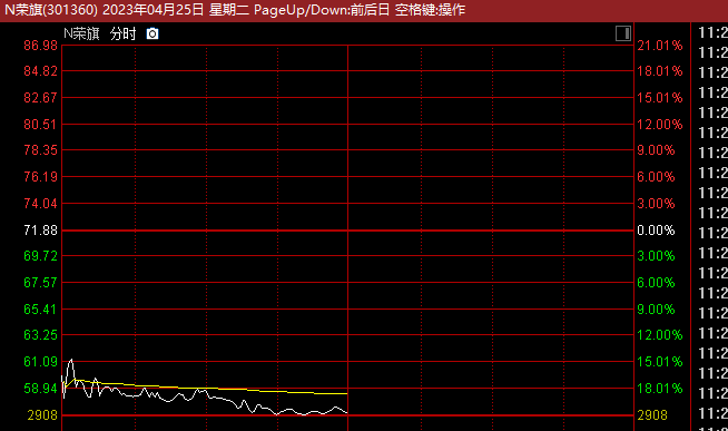 受业绩变脸影响,荣旗科技开盘即破发,低开逾16%,并继续走低,盘中最多跌逾21%。按最低价56.78元计算,投资者每一中签亏损7550元。