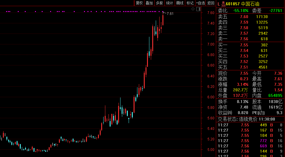 早间,石油板块指数一度大涨逾3%,创2018年1月以来5年多新高,三桶油集体上攻,其中中国石油、中国石化双双创出4年多来新高。