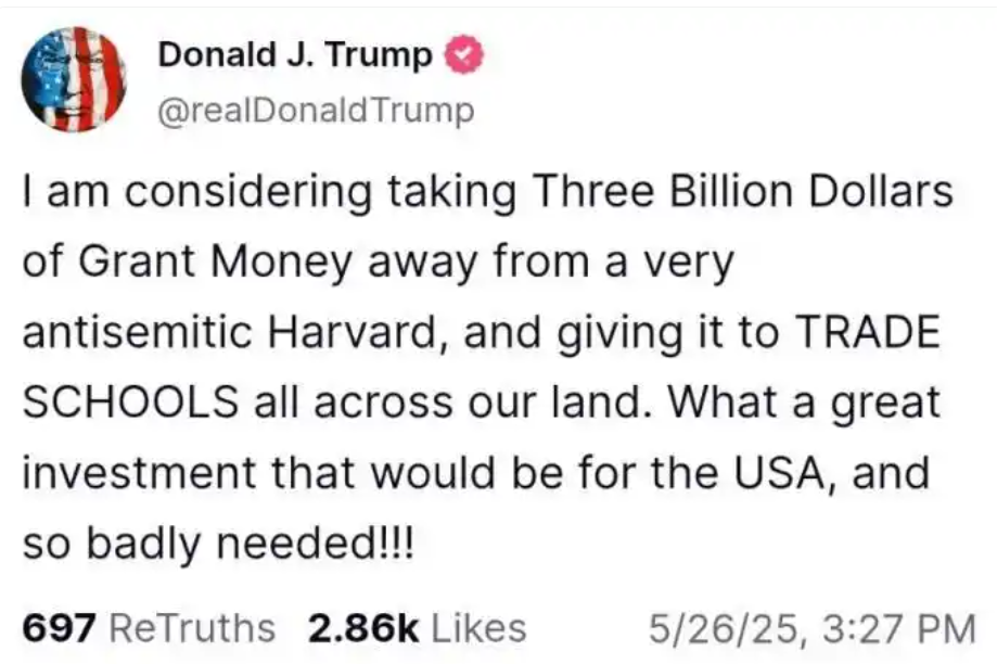 “我正在考虑从一个非常反犹的哈佛大学拿走30亿美元的拨款,把它交给我们国家各地的职业学校,”特朗普在Truth Social上写道,“这对美国来说将是多么伟大的投资,而且非常需要!!”