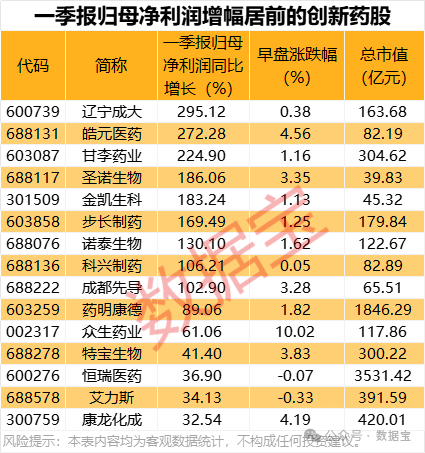 从业绩上来看,创新药板块步入快速放量期,行业盈利能力明显增强。A股一季报数据显示,有37只创新药概念股归母净利润同比增长,其中辽宁成大、皓元医药、甘李药业等9股归母净利润实现翻倍,艾迪药业、昭衍新药扭亏为盈,13股同比减亏,报喜比例超过三分之二。