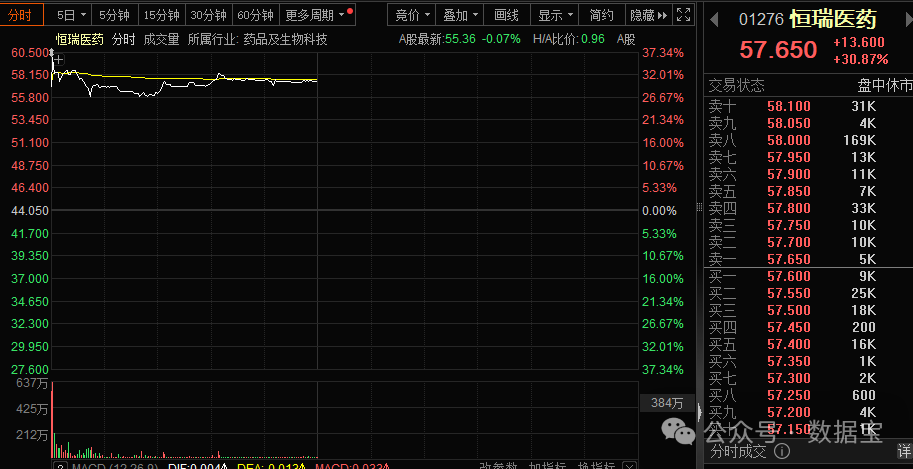 早盘恒瑞医药开盘后一度拉升,最高涨幅达到37.34%,午间收盘上涨30.87%,换手率超过30%,A股表现一般,午间收盘微跌0.07%。截至午间收盘,恒瑞医药A股市值超3531亿元,H股市值129.42亿港元。