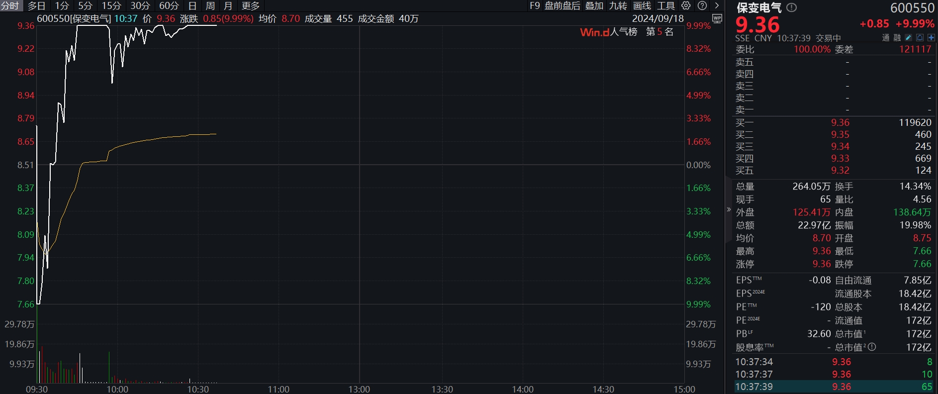 9月18日,保变电气小幅高开,开盘后快速跳水,一度触及跌停,随后快速拉升,盘中封涨停,上演“地天板”走势。截至发稿,保变电气涨停,成交额近23亿元,换手率达14%。此前,该股已连续3个交易日涨停。