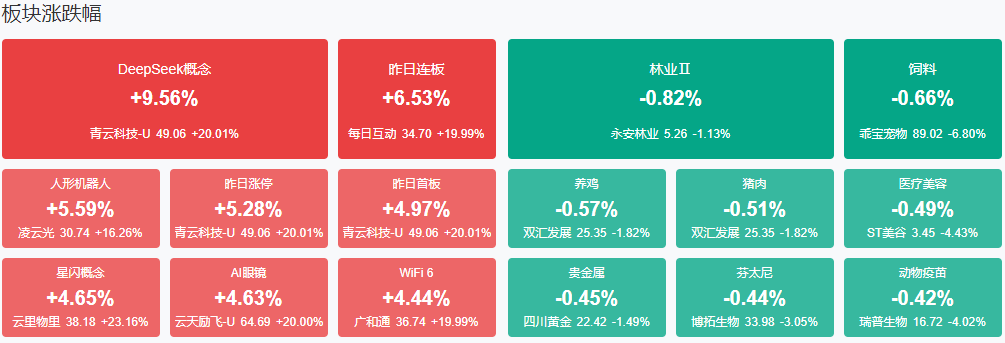 板块方面,DeepSeek概念、人形机器人、AI眼镜、算力芯片等板块涨幅居前,贵金属、家禽等少数板块跌幅居前。截至收盘,沪指涨0.76%,深成指涨1.43%,创业板指涨2.09%。