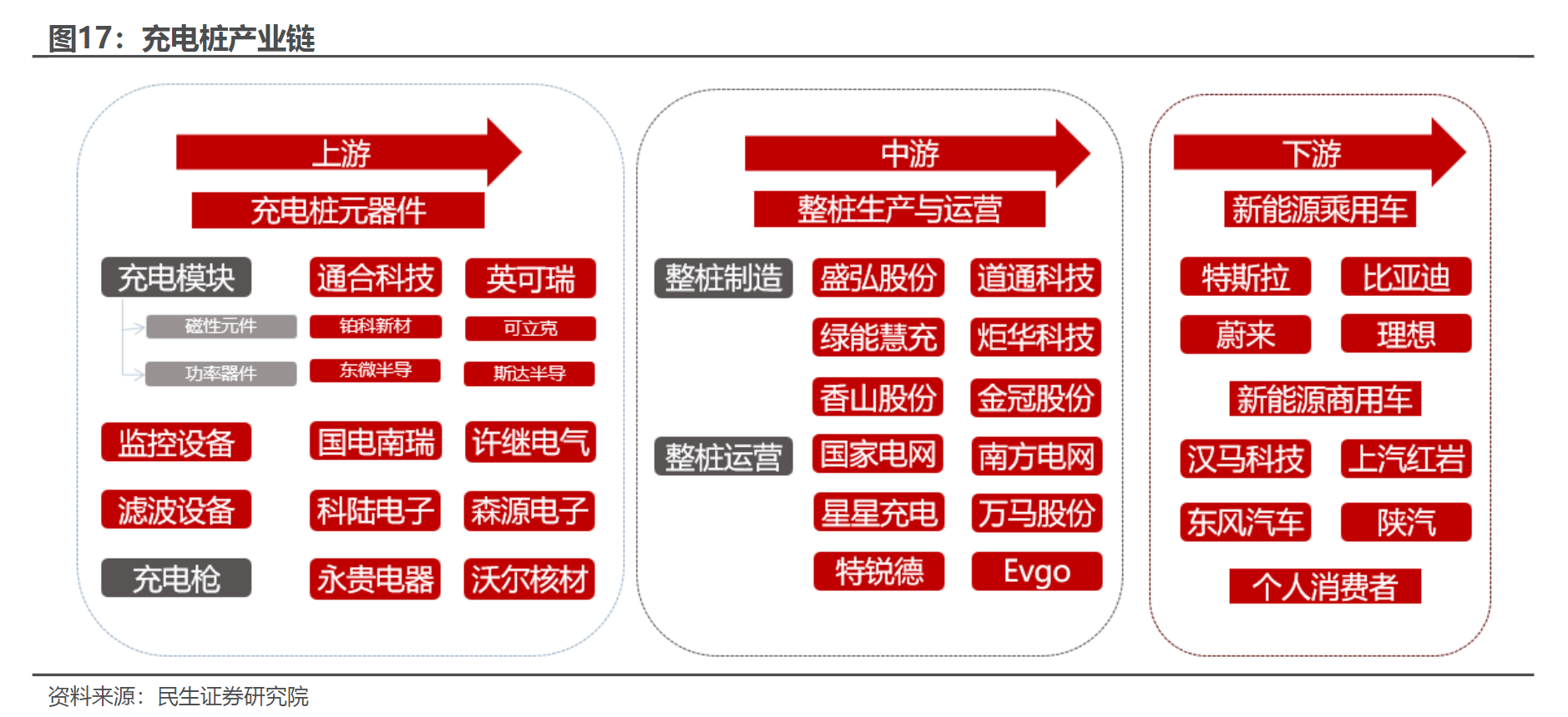 数据显示,近年来,国内充电桩行业市场规模保持增长趋势,预计2023年市场规模有望达到1200亿元。从产业链来看,上游以充电模块为核心的零部件生产制造,代表企业有通合科技、英可瑞、铂科新材、可立克、东微半导、斯达半导、国电南瑞、许继电气等;中游主要是整桩的生产制造及电站运营,整桩制造代表企业有盛弘股份、道通科技、绿能慧充等;运营代表企业有特锐德、万马股份等。下游为新能源汽车整机厂企业。