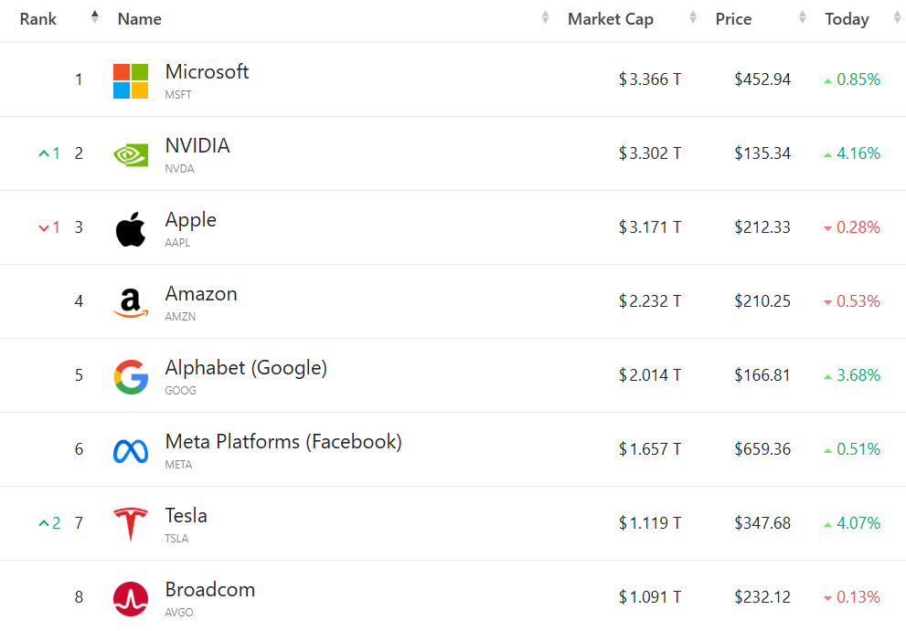 大型科技股涨跌不一,(按市值排列)微软涨0.85%,英伟达涨4.16%,苹果跌0.28%,亚马逊跌0.53%,谷歌C涨3.68%,Meta涨0.51%,博通跌0.13%。