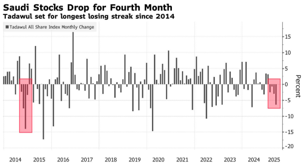 截至周二收盘,沙交所综合指数(Tadawul All Share Index)在5月份下跌了6.4%,是彭博追踪的92个股票指数中跌幅最大的。该沙特全股指数也已连续第四个月下跌,这是自2014年以来持续下跌时间最长的一次。这与更广泛的新兴市场指数形成了鲜明对比,后者正朝着自去年9月以来的最佳单月表现迈进,并且是近一年来连续上涨时间最长的一次。