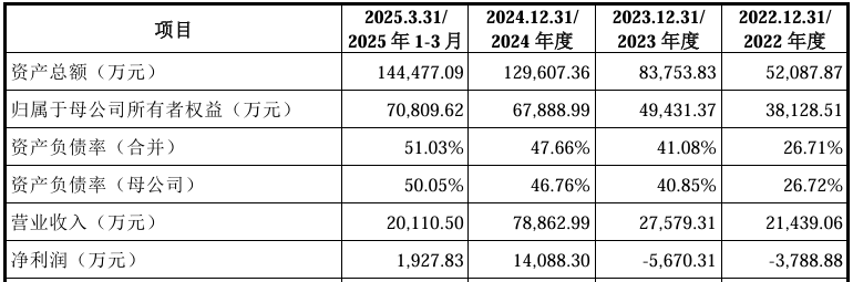 财务方面,于2022年度、2023年度、2024年度及2025年1-3月,公司实现营业收入约为2.14亿元、2.76亿元、7.89亿元、2.01亿元人民币;同期,净利润分别约为-3788.88万元、-5670.31万元、1.41亿元、1927.83万元人民币。