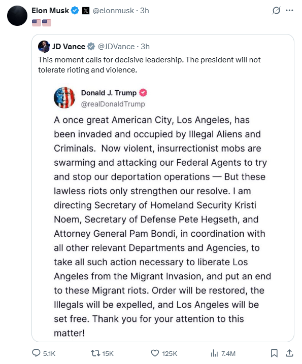 其中一则帖子中,特朗普表示洛杉矶已经被非法移民和罪犯入侵并占领,他已经任命多名高管处理此事,骚乱将得以终止,洛杉矶也将重回安全。马斯克在转发后评论了两面美国国旗,态度显然站在特朗普一边。