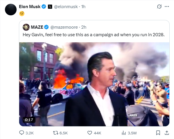 他还转发了另一条意图嘲讽纽森的帖子。其中,纽森穿着西装正在演讲,而背景则是骚乱的洛杉矶街头。发帖者称,纽森可以用这个视频去参加2028年的美国大选。