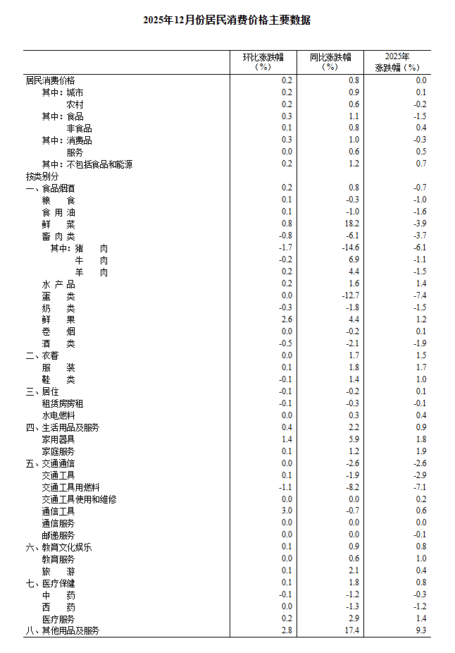 2025年12月份,全国居民消费价格同比上涨0.8%。其中,城市上涨0.9%,农村上涨0.6%;食品价格上涨1.1%,非食品价格上涨0.8%;消费品价格上涨1.0%,服务价格上涨0.6%。