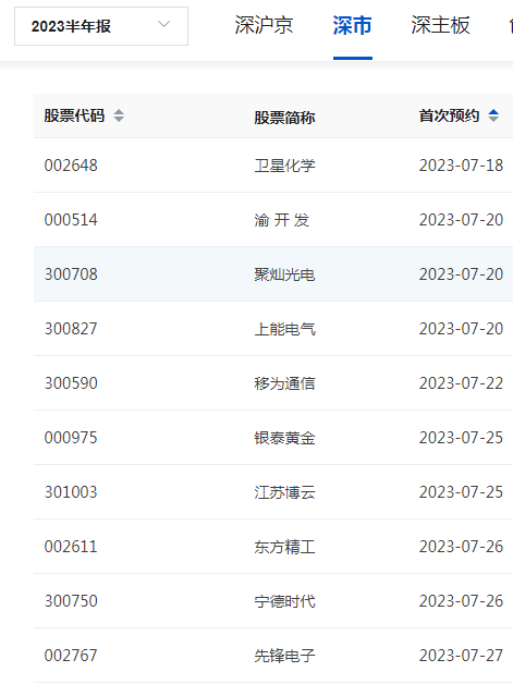 深交所公布半年报预约披露情况:卫星化学拔得头筹,将于7月18日披露2023年半年报。渝开发、聚灿光电、上能电气将于7月20日披露。