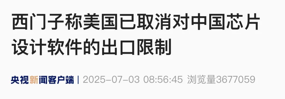 据央视新闻报道,总台记者当地时间7月2日获悉,德国西门子股份公司收到美国政府的通知称,美国已取消对中国芯片设计软件的出口限制。根据公司声明,这家德国供应商已恢复中国客户对其软件和技术的全面访问。