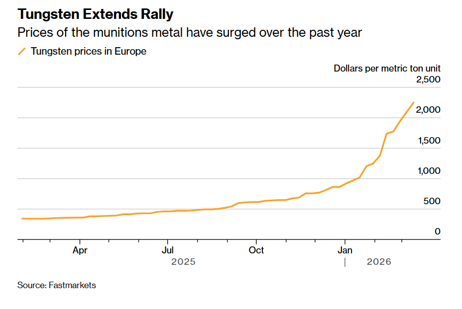 现代战争中大量无人机、导弹及反制系统都在大举抬升钨的战略需求。换言之,钨不是像黄金那样主要靠避险情绪上涨,也不是像铜那样主要押注经济复苏,它更像是被军备消耗、关键制造和政策对抗同时推着走,再加上钨市场本身市场规模小、交易不透明且缺乏流动性,所以价格弹性远比铜、原油以及2025年猛涨70%的黄金这类核心商品涨势更夸张。