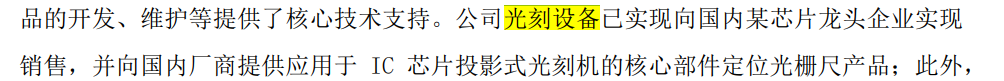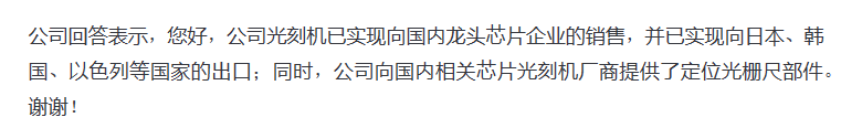 记者留意到,苏大维格2023半年报中曾提及,“公司光刻设备已向国内某芯片龙头企业实现销售,并向国内厂商提供应用于IC芯片投影式光刻机的核心部件定位光栅尺产品”,与今天在投资者平台的回复内容类似。不过,今天公司在互动平台的表述,“光刻设备”一词变成了“光刻机”,引发市场遐想。