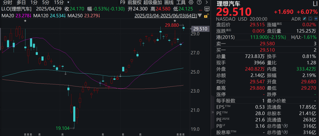中概股也多数上涨。纳斯达克中国金龙指数收涨0.56%,理想汽车涨超6%,爱奇艺涨超3%,拼多多、小鹏汽车涨近2%。