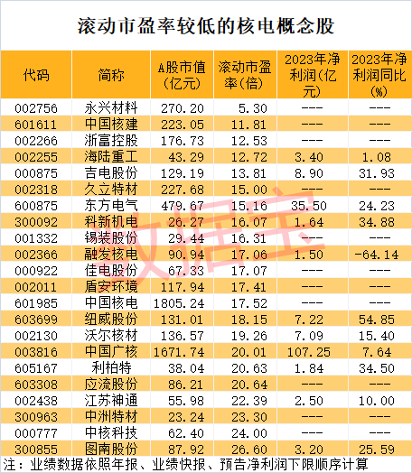 从估值水平来看,截至4月15日收盘,超六成概念股滚动市盈率低于30倍。永兴材料、中国核建、浙富控股、海陆重工、吉电股份滚动市盈率排在较低位置。