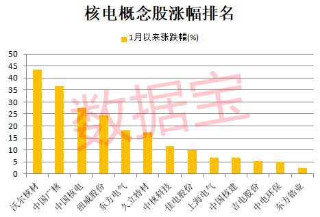 证券时报·数据宝统计显示,截至4月15日收盘,核电概念股A股市值合计7209亿元。今年以来,概念股平均下跌2.41%,跑输同期上证指数。9只概念股逆市大涨,年内涨幅超10%,包括沃尔核材、中国广核、中国核电、纽威股份、东方电气等。