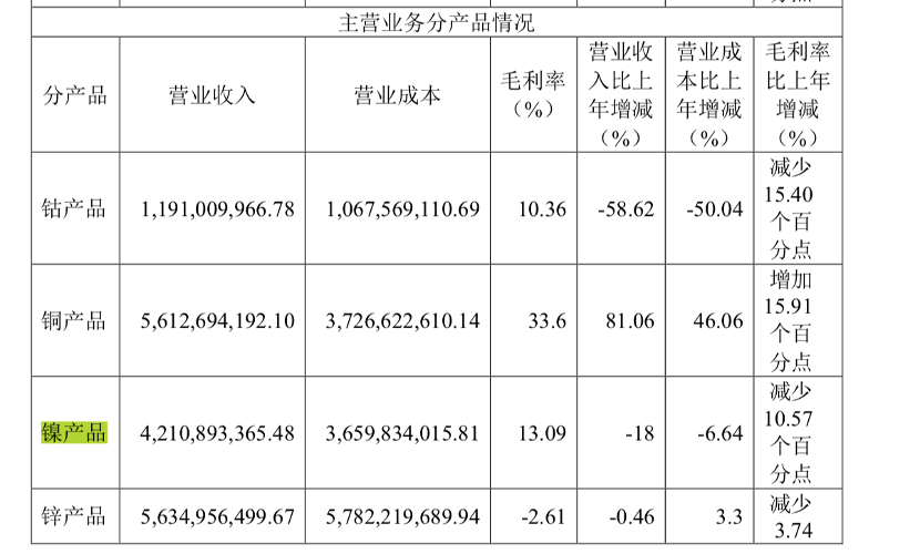此外,进一步分析盛屯矿业的营收结构,主营产品毛利率波动较大。2023年,钴产品、镍产品、锌产品的毛利率为10.36%、13.09%、-2.61%,比去年分别减少15.4个百分点、10.57个百分点、3.74个百分点。仅铜产品在2023年毛利率为33.6%,大幅增长15.91个百分点。