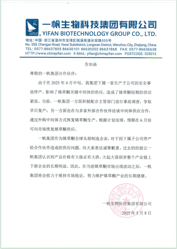 烯草酮龙头公司,一帆生物自己公告,说由于在2025年4月中旬,我集团下属一家生产子公司因安全事故停产,影响了烯草酮关键中间体的供应,造成了烯草酮短期的供应紧张。当前,一帆集团一方面积极配合主管部门进行事故调查,争取早日复产;另一方面也在与多家外部合作伙伴治谈中间体供应合作,通过外购中间体方式恢复烯草酮生产。根据计划安排,预期在6月份可向市场恢复烯草酮供应。我们从此可以看出,首先公司公告是5.8号,其次是公司说6月初开始恢复想市场供应烯草酮。就是说至少到5月底公司烯草酮产能处于停产状态。那么市场短缺的情况起码到5月底是无法得到缓解的。这段时间,烯草酮价格大概率会继续上涨。