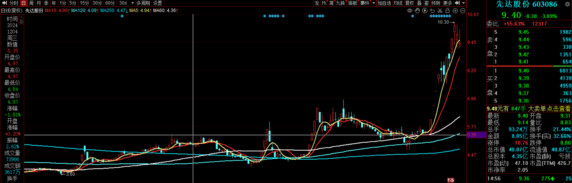 我们在来看下,行业龙头公司先达股份股价和烯草酮涨价的关系,公司烯草酮产能约1.1万吨,单吨成本不到7万,按照目前10万元/吨的价格计算,公司时点的利润有3.3个亿。利润弹性是烯草酮每涨价1万元,后增公司利润1.1个亿。给化工周期高点,10倍估值左右,算是先达股份其他除草剂和杀虫剂的利润,全年时点利润4个亿左右,公司目前合理市值在40亿市值。整体看市场还是比较克制,并没有特别去计提未来烯草酮可能涨价,比如涨价到15万元/吨。而短期先达股份的股价也表明了一点,市场资金会提前预期在目前价格下,公司的合理全年市值。同时并不会在意未来是否公司正在可以达到目前的时点利润。所以作为投资者,我们更应该关注,在烯草酮涨价的持续景气度,只要我们可以通过研究分析,判断出烯草酮继续涨价的概率和持续涨价的时间,我们就可以做投资中获得一定的胜率和赔率。