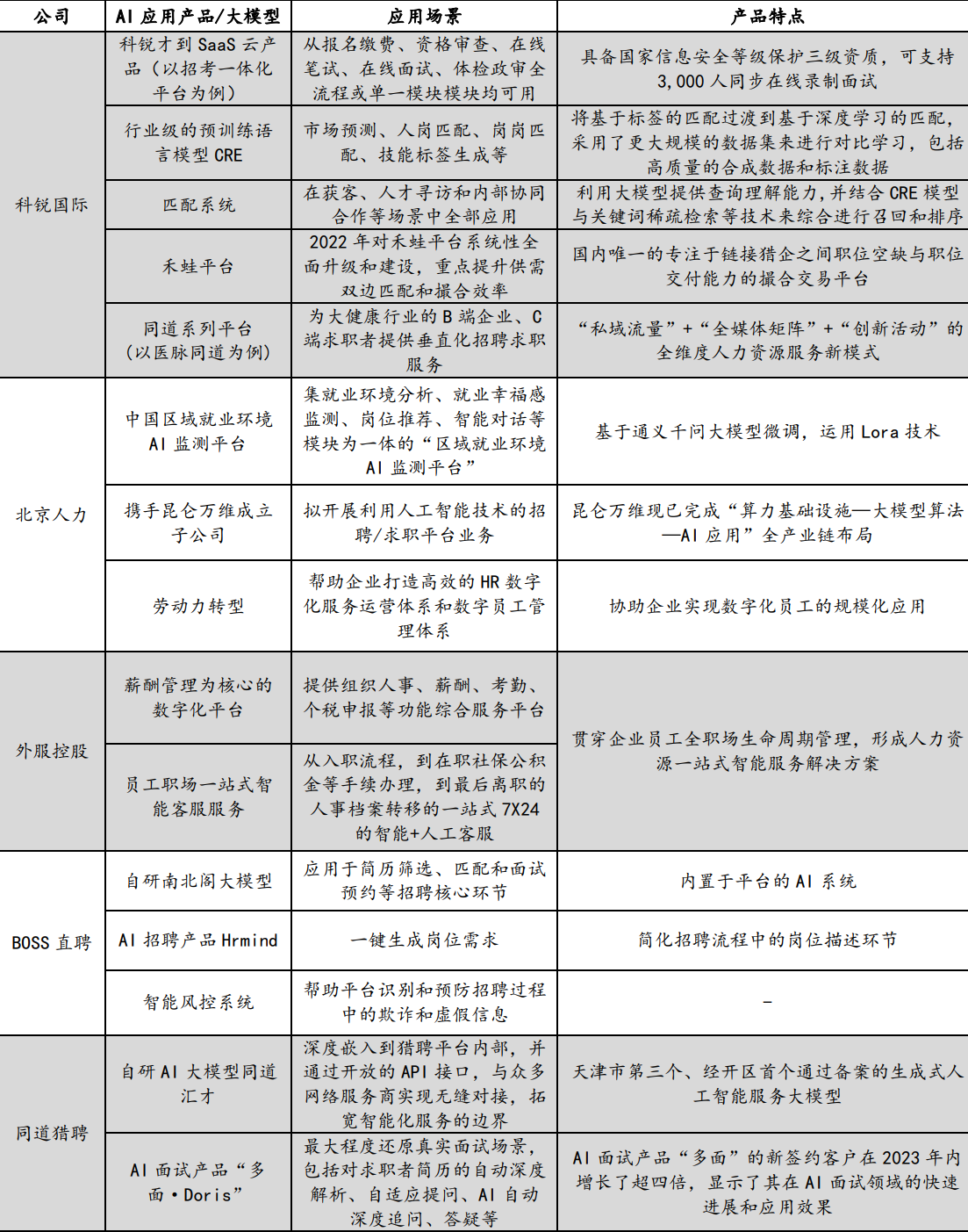 多家上市人服企业已自研出大模型,在招聘、面试等环节已实现AI技术应用。上市人服企业在AI应用领域均已有成果,如【科锐国际】发布了面向技能与招聘的行业级预训练语言模型CRE并进一步启动匹配系统,目前已经在获客、人才寻访和内部协同合作等场景中全部应用;【北京人力】推出国内区域就业环境AI监测平台,可实现就业岗位智能分析与推荐;【外服控股】已搭建起一站式智能解决方案,包括全流程智能薪酬、智能客服、智能健康;【BOSS直聘】研发自有模型南北阁,前面应用于简历筛选、匹配、面试预约等环节;【同道猎聘】推出AI面试产品多面 Doris,可实现自适应提问、AI自动深度提问等。