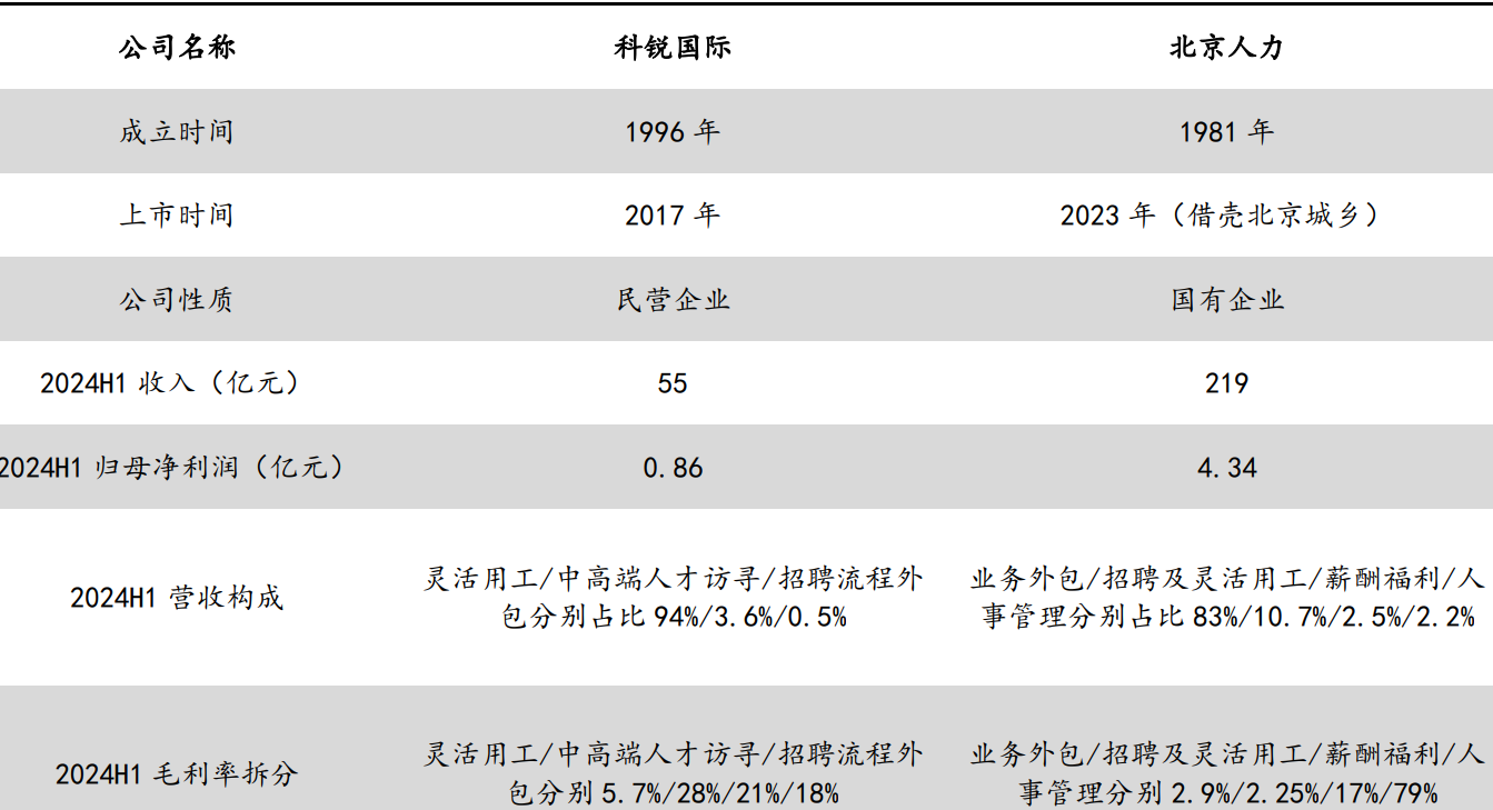 人服龙头经营已边际改善,估值筑底回升。人服板块盈利环比回暖,期待经济好转后业绩弹性释放。科锐国际起家猎头、扎根招聘及灵活用工业务;北京人力核心收入来自业务外包,同时可提供人服各细分领域的综合性服务。