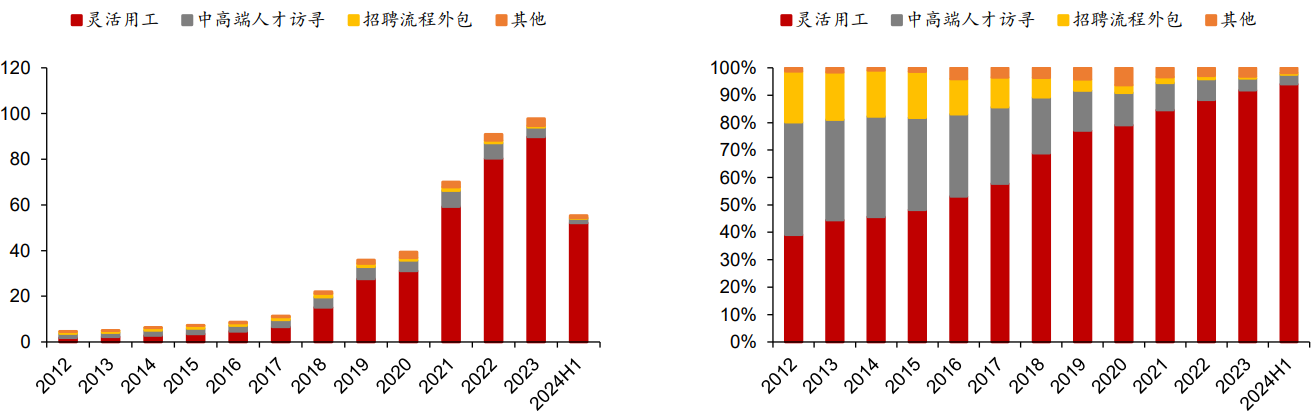 从营收构成来看,灵活用工快速增长,收入占比逐步增长至90%以上。分业务看,公司收入规模快速增长主要系灵活用工业务增长驱动,2012-2022年灵活用工业务收入符合增速为46%,占总营收比例从39%提升至88%。此外,猎头/RPO业务2012-2022年收入复合增速分别为14%/2%,合计占总营收比例从 60%下降至9%。2023年以来灵活用工占比持续提升,2024H1其占公司总营收比例为94%,是公司收入的核心来源。