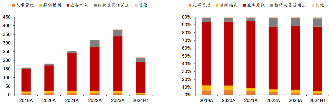 近几年随业务外包服务快速增长叠加毛利率提升,业务外包服务对毛利的贡献逐年提升。传统业务中的人事管理和薪酬福利业务毛利率较高,远高于公司其他业务,2019 年业务外包服务在贡献 81%收入的同时,仅贡献 25%的毛利,而人 事管理与薪酬福利合计贡献收入/毛利分别为 12%/70%;近几年随业务外包服务 毛利率的提升及收入的快速增长,业务外包服务逐步超过人事管理成为对公司 毛利贡献最大的业务,2024H1 人事管理/薪酬福利/业务外包贡献收入分别占比 36%/9%/50%。