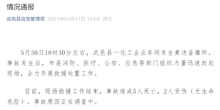 河北省武邑县应急管理局发布通报:5月30日18时30分左右,武邑县一化工企业车间发生煮洗釜爆炸。事故发生后,市县消防、医疗、公安、应急等部门组织力量赶赴现场,全力开展救援处置工作。