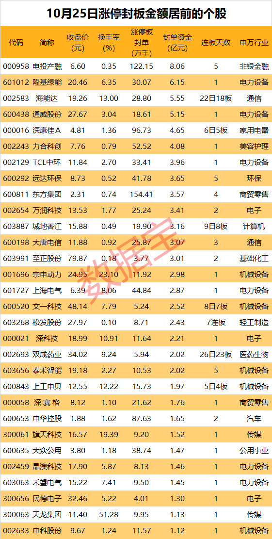 以封单金额计算,38股封单金额超1亿元,其中电投产融、隆基绿能、海能达封单金额居前,分别为8.06亿元、6.15亿元、5.55亿元。