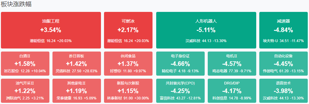 板块方面,油气、白酒、小金属、工程机械等板块涨幅居前,人形机器人、CPO、Sora概念、铜缆高速连接等板块跌幅居前。截至收盘,沪指跌0.88%,深成指跌1.37%,创业板指跌2.07%。