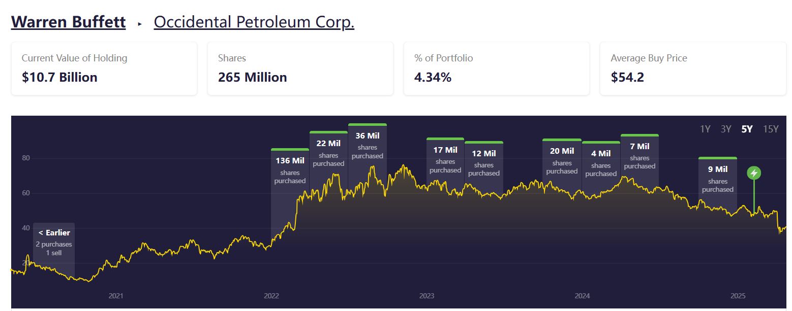 伯克希尔上一次增持西方石油是在今年2月,当时的股价为每股47美元,这可能是巴菲特觉得股价便宜的位置。
