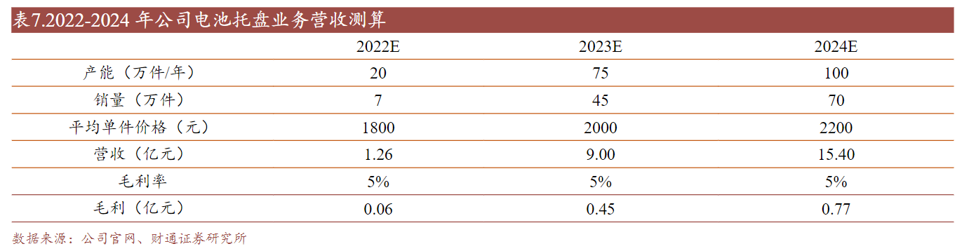 公司于2021年快速切入托盘市场,成立子公司众源新能源负责托盘业务,积极扩增产能,打开盈利增长第二曲线。公司电池托盘主要客户为奇瑞、哪吒,并承接了奇瑞、哪吒新能源汽车全系车型的电池包托盘业务,根据乘联会数据,2022年奇瑞汽车共计销售新能源车23.28万辆,哪吒汽车共计销售新能源车15.21万辆,下游客户需求旺盛,产能消化有保证。