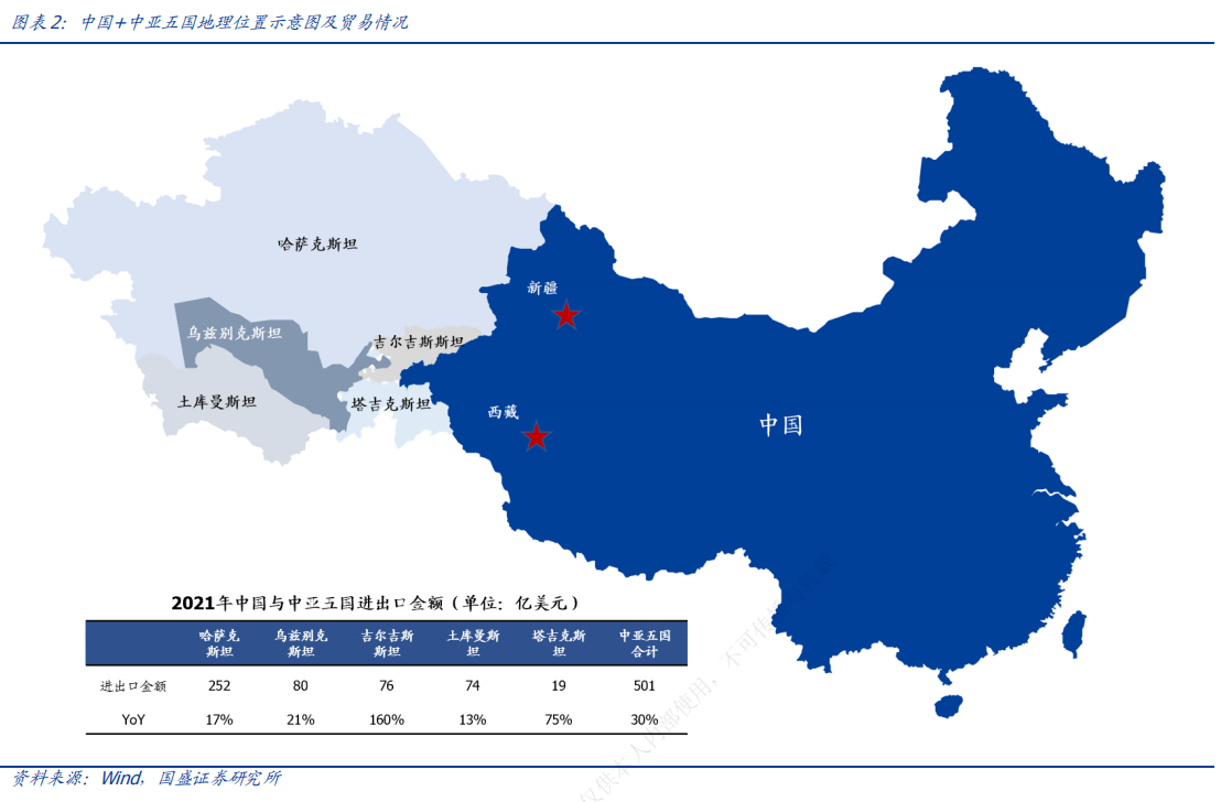 从地理位置来看,我国与中亚五国山水相依,疆、藏毗邻吉尔吉斯斯坦、坦吉克斯坦、哈萨克斯坦,并通过多个口岸与乌兹别克斯坦、土库曼斯坦相连。