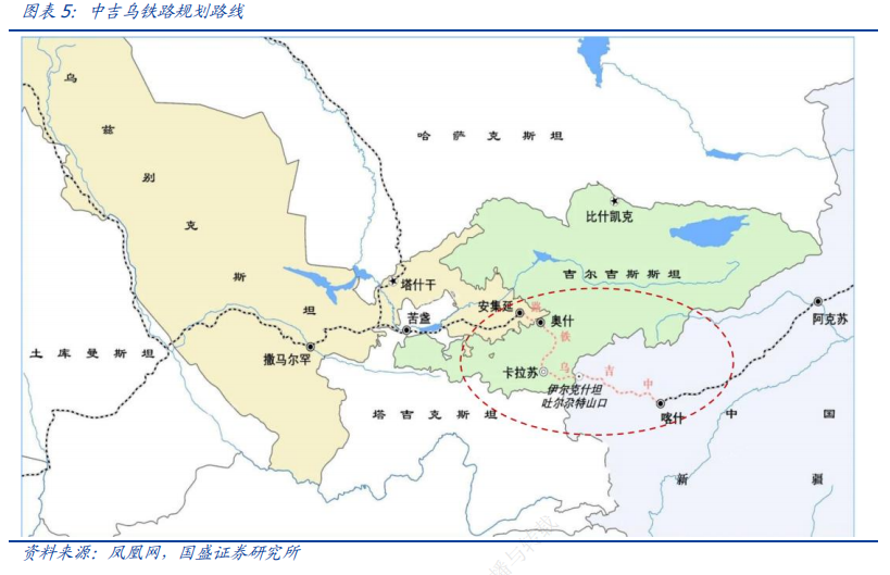 其中,中吉乌铁路作为中亚地区互联互通的战略性工程,备受顶层关注。该标杆项目将于今年秋季正式动工,项目全长523公里,中吉乌三国境内的铁路规划里程分别为213/260/50公里,起于中国新疆喀什,经吉尔吉斯斯坦卡拉苏,终于乌兹别克斯坦安集延,根据吉国交通部副部长乌兹巴耶夫表示,该项目仅吉国境内部分预估总投资额就达45-50亿美元,项目整体规模较大。