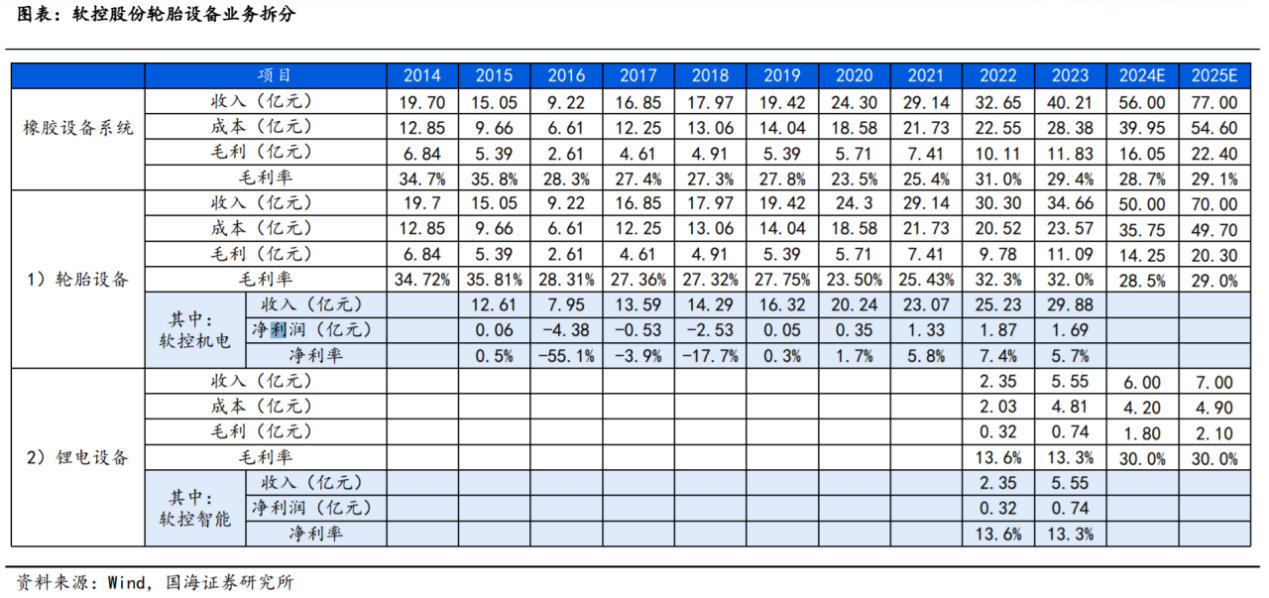 2)锂电设备板块,公司产品集中在价值量更高的前段工序,下游客户覆盖宁德时代、比亚迪。2023年末,公司合同负债达41.69亿元,其中轮胎设备占比85%,约为35.44亿元,锂电设备占比15%,约为6.25亿元。