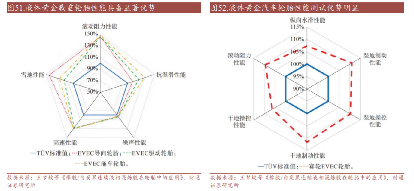 迈向高端轮胎市场,新材料液体黄金有望打开第二成长曲线:液体黄金轮胎打破“魔鬼三角”定律,兼顾“安全、节能、耐磨性能”。从使用端看,平均1条液体黄金卡客车胎、轿车胎分别降低能耗4%、3%+,使用液体黄金轮胎的新能源轿车可提高续航5%-10%。公司液体黄金生产一期产能已建设完成,2023年收入为9.91亿元,同比+86%,实现净利润3461万元,较2022年的235万元提升显著。下游除汽车轮胎外,在消费品、工程设备传输带方面预计应用广阔,未来放量可期。