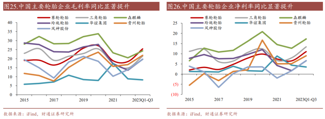 1)中国轮胎企业短期扩产动力:原材料价格下降,国内轮胎行业盈利复苏国内主要轮胎企业2023年毛利率、净利率同比均显著提升。2023年,中国轮胎行业整体经营形势全面复苏。随着全球汽车产业链复苏叠加出行活动恢复,轮胎需求回暖,轮胎企业产销两旺,行业景气度不断提升。企业盈利水平也呈大幅改善趋势,主要企业收入和利润同比大幅增长,毛利率、净利率平均提升5.11、3.94pct。