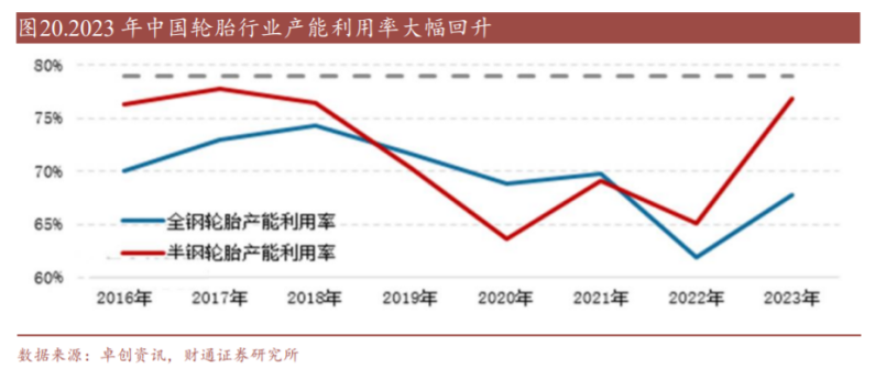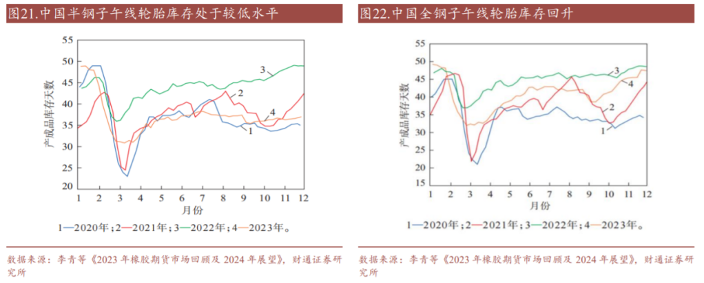 较于全钢子午线轮胎,2023年半钢子午线轮胎库存处于较低水平且开工率较高,下游市场需求旺盛。
